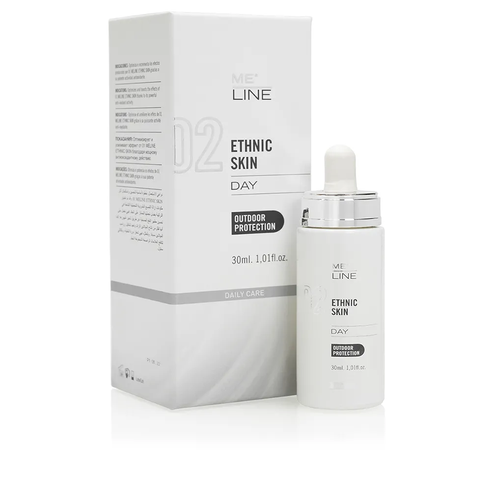MeLine Ethnic Day er et aktivt dagserum som bidrar til å redusere synligheten av ujevn hudtone og pigmentflekker. Nøye utvalgte ingredienser jobber i synergi for å både korrigere og forebygge ujevn hudton hos de med fototype 4-6. Kan ikke anvendes av gravide eller ammende. -
